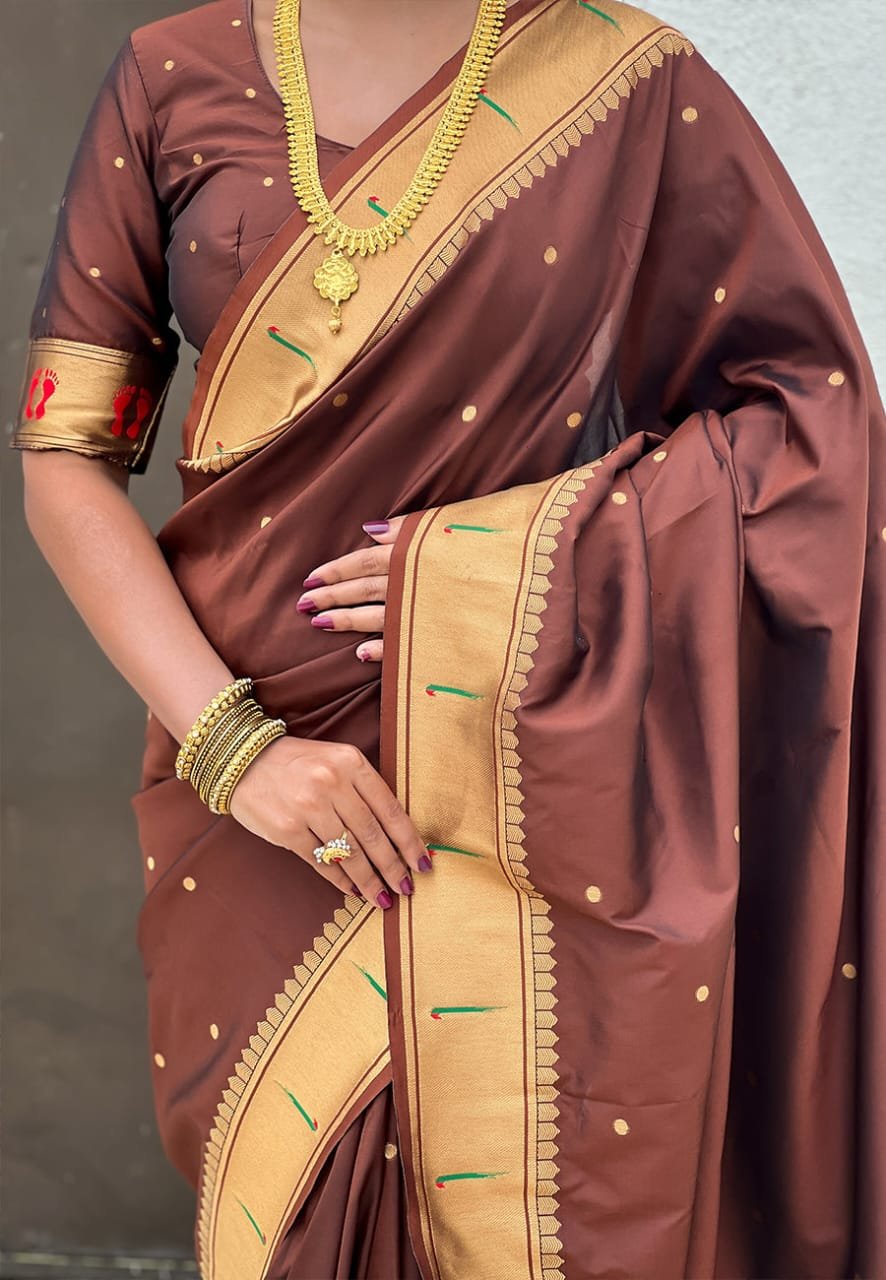 The rich coffee brown body is adorned with delicate golden butti work scattered throughout, creating a subtle shimmer against the warm, earthy base. The saree’s most captivating feature is its magnificent golden pallu, which showcases traditional Paithani artistry at its finest. The pallu features intricate woven designs including the sacred lotus (representing purity and prosperity), Lord Ganesha (the remover of obstacles), vibrant red Lakshmi footprints (symbolizing the goddess’s blessings), peacock motifs, and geometric patterns – all meticulously woven in gold, red, and brown threads.